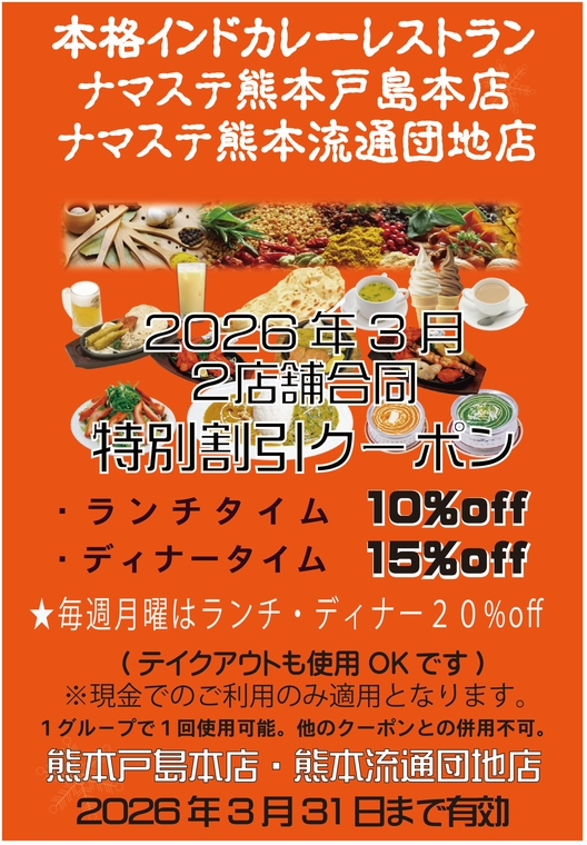 現在、ナマステ 熊本戸島店、熊本流通団地店の両店共通割引クーポンをLINEのお友達登録いただいた方やインターネット上で配布しております。2026年3月も大好評のランチ10%Off、ディナー15%OFFのクーポンを継続いたしま。また、2026年3月より戸島本店、熊本流通団地店両店で月曜日限定でランチ・ディナーともに20%offとなりました。