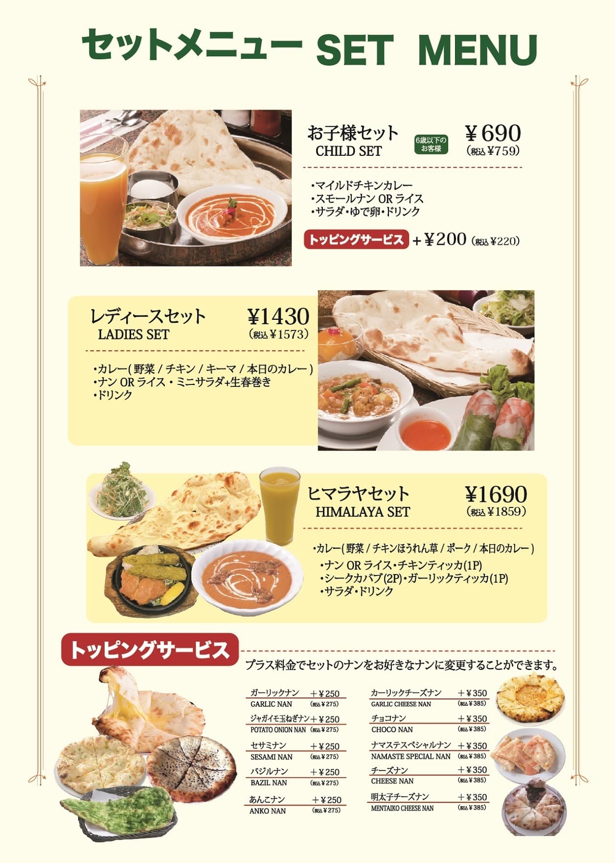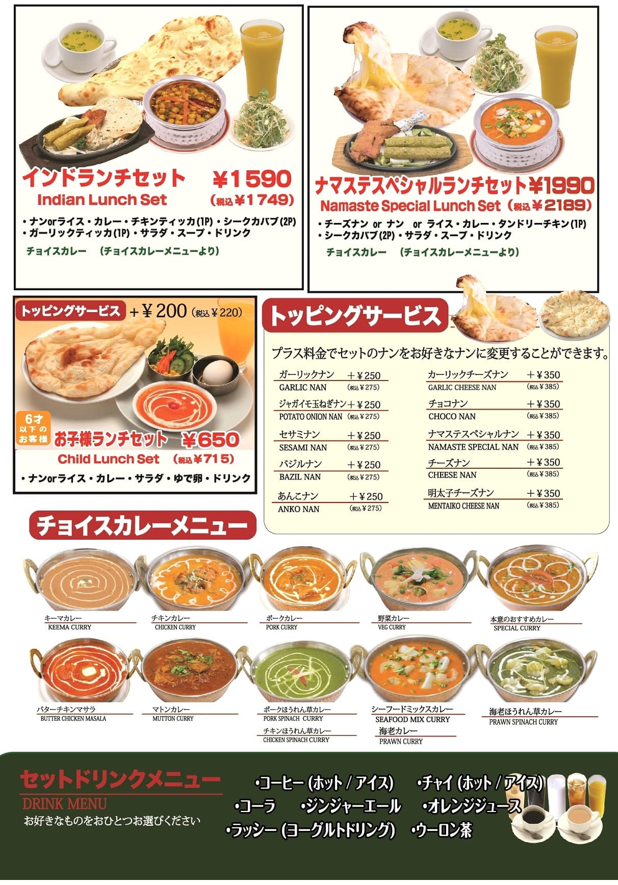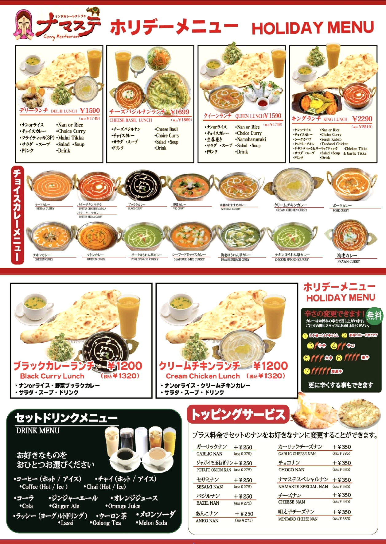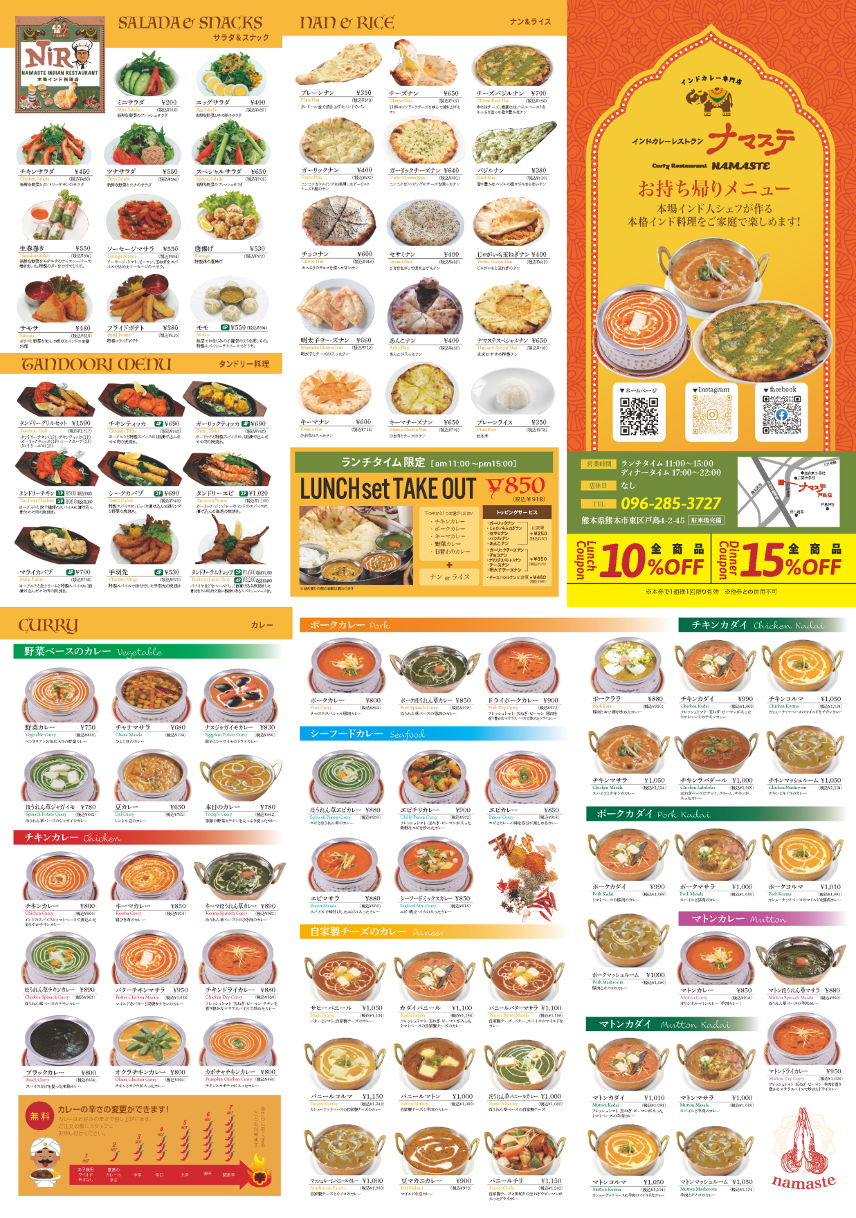 TOP お店のご案内 ナマステ熊本戸島本店 ナマステ熊本流通団地店 メニュー 熊本戸島本店メニュー 熊本流通団地店メニュー 営業時間・店休日 営業時間 店休日 運営会社 お知らせ・フェアなど お店からのお知らせ フェアキャンペーン ご挨拶 熊本戸島本店メニュー グランドメニュー ランチメニュー テイクアウトメニュー パーティーコース 単品メニュー、サイドメニュー、セットメニュー、食べ放題、飲み放題がございます。 ご予約はこちらから