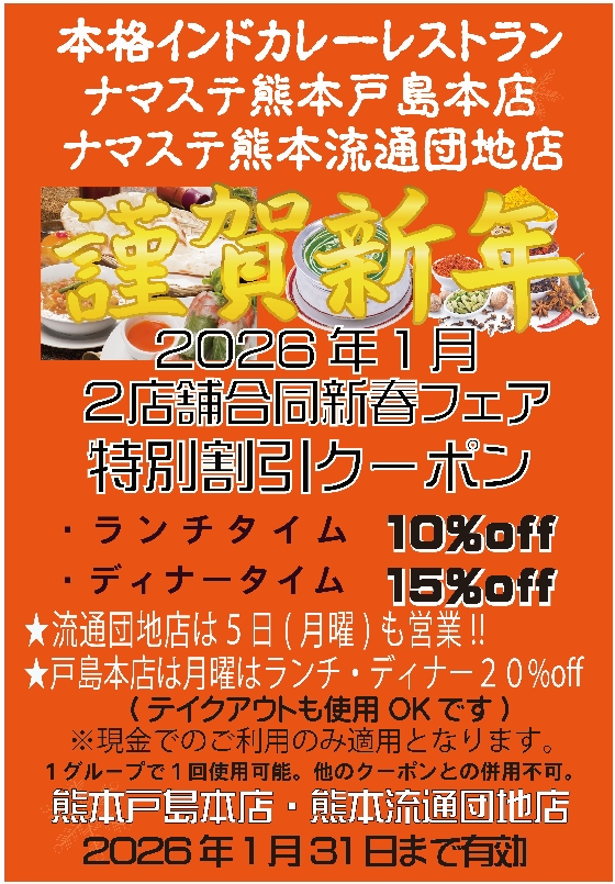 現在、ナマステ 熊本戸島店、熊本流通団地店の両店共通割引クーポンをLINEのお友達登録いただいた方やインターネット上で配布しております。2026年1月も大好評のランチ10%Off、ディナー15%OFFのクーポンを継続いたしますが、戸島本店のみ、月曜日限定でランチ・ディナーともに20%offとなります。