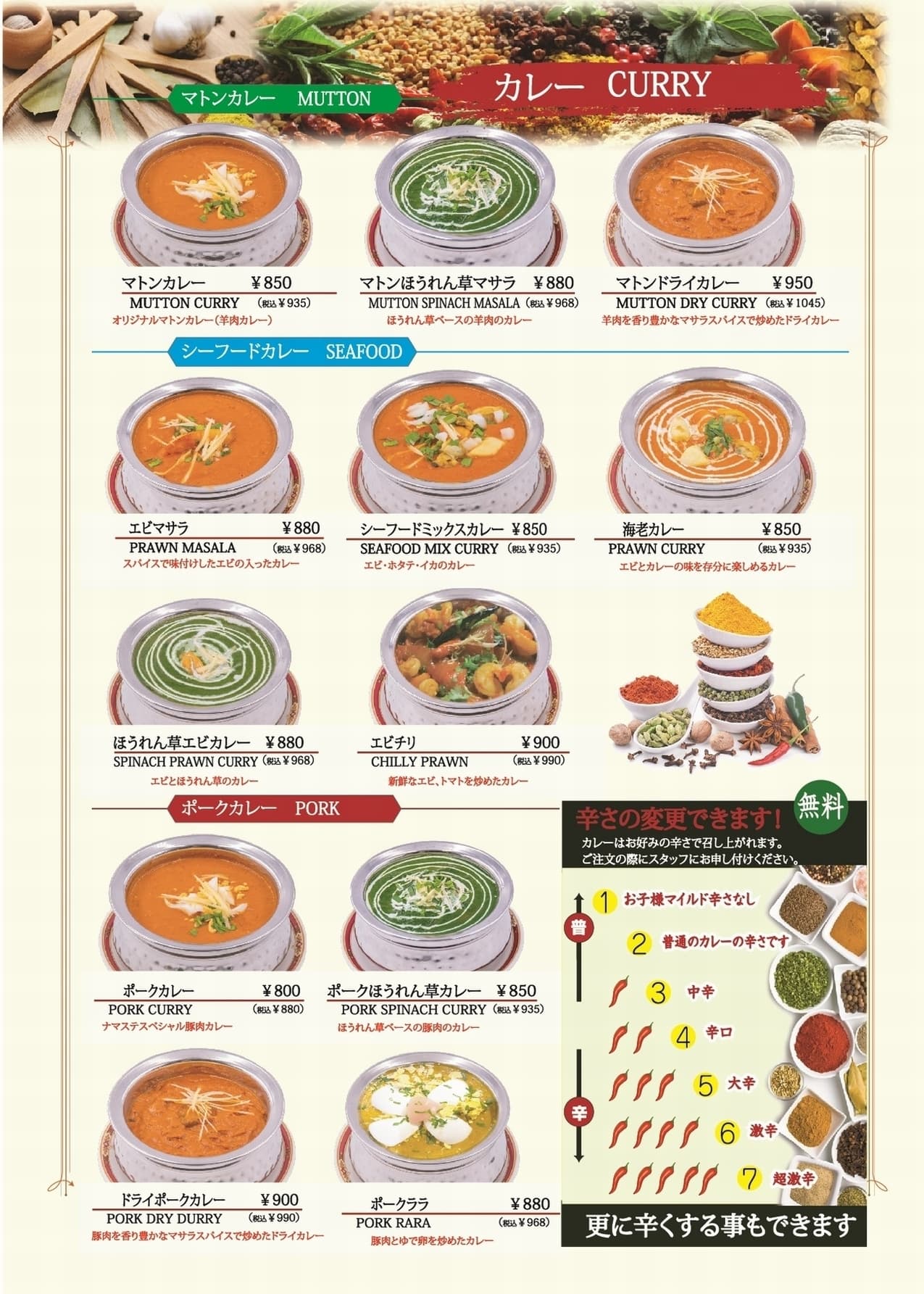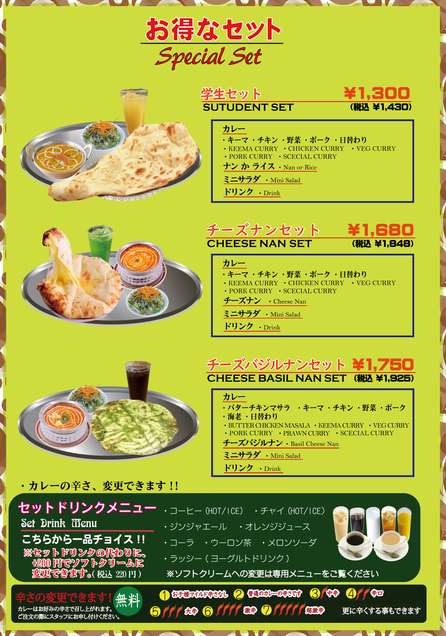 TOP お店のご案内 ナマステ熊本戸島本店 ナマステ熊本流通団地店 メニュー 熊本戸島本店メニュー 熊本流通団地店メニュー 営業時間・店休日 営業時間 店休日 運営会社 お知らせ・フェアなど お店からのお知らせ フェアキャンペーン ご挨拶 熊本戸島本店メニュー グランドメニュー ランチメニュー テイクアウトメニュー パーティーコース 単品メニュー、サイドメニュー、セットメニュー、食べ放題、飲み放題がございます。 ご予約はこちらから